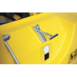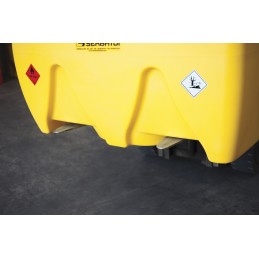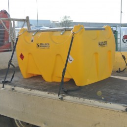 Fabricado em polietileno linear, é equipado com os seguintes acessórios: tampa reforçada com trava, tampão de enchimento de alumínio para o compartimento de Diesel e tampão de enchimento de polietileno para o compartimento de AdBlue®/DEF, com dispositivo de ventilação integrado, unidade de transferência de combustível, bolsas para empilhadeiras integradas para içamento de carga completa por baixo, olhais de içamento para içamento de carga completa por cima e para fixação de cintas de fixação, novas conexões rápidas de encaixe. Todos os acessórios são feitos de alumínio ou materiais compatíveis com Diesel e AdBlue®/DEF.